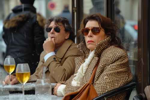 men and woman covered with some cascade of brown hair after a little explosion, little bits of brown hair in the nose and in the skin of both, elegantly dressed, astonished like after an explosion, sitting at a table of a bar in the street while outide it's started raining, beautiful fifty-year-old woman with tanned skin and dressed in elegant fashion holds a handbag while it's raining outside, The Simpson cartoon movie scene, --ar 3:2 --v 6.0
