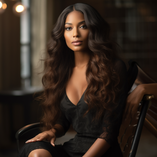 Create an elegant and professional profile picture a hair company using black woman with long straight black lace front wig, wearing soft glam makeup, professional photography, hyper realistic, beautiful skin tone and texture, full body, hair styled in sleek long straight, grey background, professional lighting setup. The background should be neutral to highlight her face. She is looking at camera directly in eye level. --v 6.0