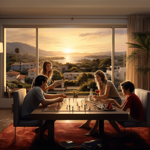 familia en sala jugando juegos de mesa, vista elevada, alta definicion, hyperrealista, luz de dia, casa elegante