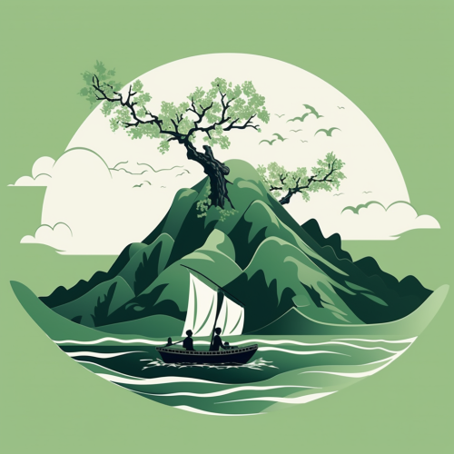 Minimalist illustration in esoteric style, a little boy is sitting on a boat, the boat is stuck on a mountain top, this mountain top has a lot of green trees, the boat is very big like a pirate's boat