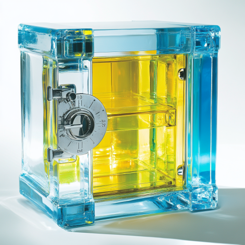 a very large crystal clear themed safe that is empty with a locking dial on it and the locking spinning handles. in the theme of modern and minimal with a layer of bright yellow liquid inside under a layer of bright blue liquid with a white background.