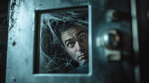 View from inside an empty safe with cobwebs, you can see the door of the safe open and a manager looking inside the safe with a panicked look on his face, realistic, --ar 16:9
