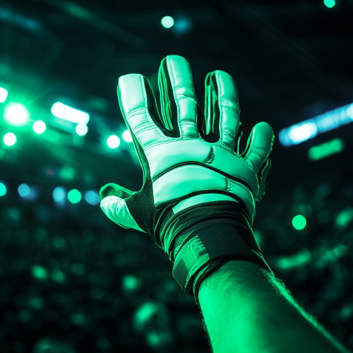 Arena, basketball competition, basketball fan holding a big glove with outstretched finger. Glove colors are white and green, semi-blurred background, mockup, Full HD, High Definition, shot with Canon EOS R5 F1.2 ISO 100 80mm