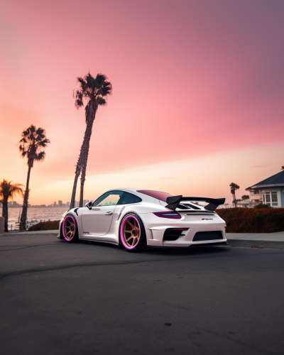 a full-frame shot of a heavily modified and lowered white and pink 2023 Porsche 992 liberty walk body kit style, shown from a side on angle, parked with a clean background next to the coast in California, perfectly clean car wrap, photorealistic, cinematic, vibrant natural lighting, shallow depth of field, ultra high definition, 32k resolution, highly detailed, real life photo look, pro photo RGB. --v 5.0 --ar 4:5