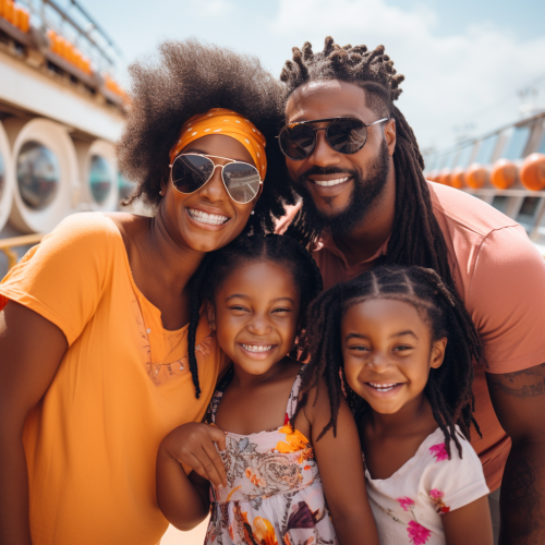black family in their 30's with children on a cruise llaughing, smiling, long black hair long lashes,, long nails, in urban clothing wearing bright colors. excited and ready for a tropical vacation, very realistic photo, 80mm lense