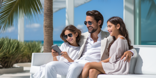 indian family of father, mother, young daughter sit on a bench smiling and waving at phone. White clothing, white luxury hotel, infinity pool, palm trees, clear sky, bright lighting, bright colors --upbeta --s 250 --v 5.2 --ar 2:1