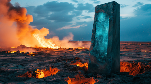 A black god stands by glowing monolith.