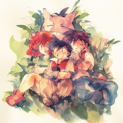 in the style of pokemon watercolor paintings, a group of rancher style pokemon trainers huddled together, their hands are all bound, and they look terrified, pokemon 90s anime style, long pupil old school pokemon anime style, --niji 6