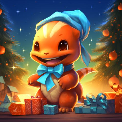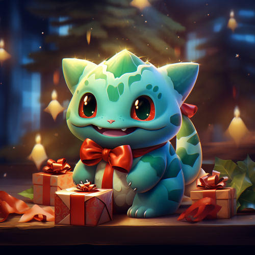 A cute Bulbasaur Pokemon illustration using smooth lines sitting underneath a Christmas tree whilst hold a red present wrapped in a blue ribbon, vibrant and warm colours