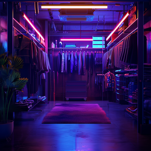 Create a master closet render for real esate with the theme of cyberpunk. Shot on Cannon EOS R5 Mirrorless. Hyper Real, like something from a luxury magazine. --v 6.0 --ar 1:1 --c 15