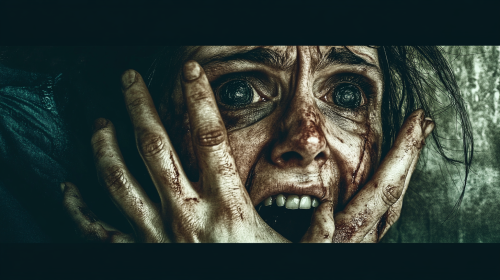 Threatening male demon subtle tauning smile animal eyes placed over the face deformed hands strips of dark decomposing skin in a dark wet basement monster darker lighting scary shadowy noir color --ar 16:9 --weird 2000 --v 6.1 --style raw