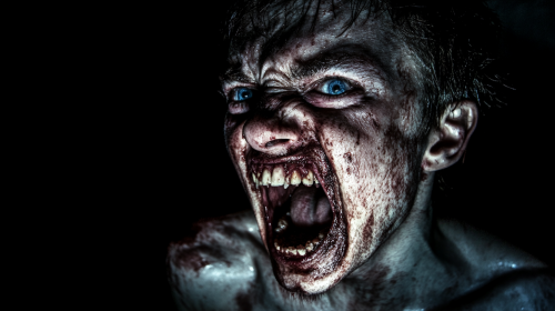 A threatening male demon displaying 10 different eyes over the face and strips of black and grey dark decomposing skin in a dark wet basement monster movie lighting scary shadowy color --ar 16:9 --weird 2000 --v 6.1 --style raw