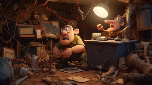 Two quirky HVAC technicians in a Pixar style, one tangled in ductwork while the other reads a manual upside down, in a cluttered basement filled with tools and old furniture, humorous and chaotic scene with dim lighting, Sculpture, clay model with exaggerated features and expressive poses, --ar 16:9 --v 5.0