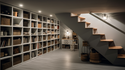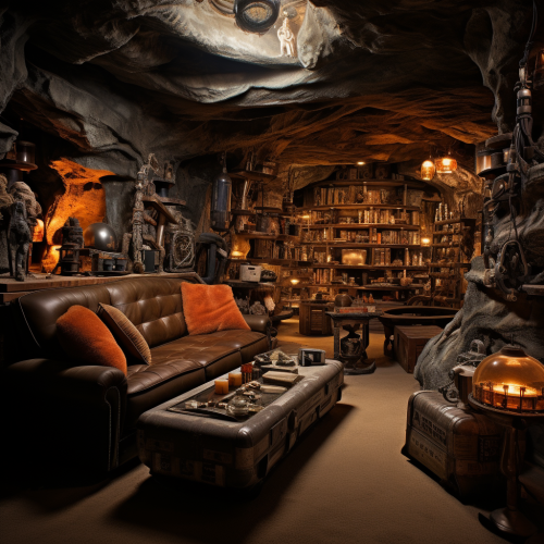 design a basement room, that has egress windows, that has a bar, bug screen tv, a couch/murph bed and pool table in mid century design style --s 250 --style raw