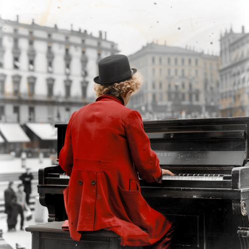Piazza San Pietro in Trieste in 1913.. An elegant blond young man, with a typical 1913 hat and dresses, plays a piano facing back. black and white image, old photo, some red colours