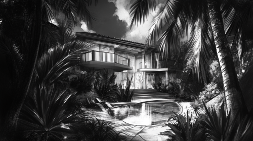 storyboard illustration of a beautiful vacation rental property, refracted light in the foreground, concept art, storyboard, black and white, pencil drawing, --ar 16:9 --v 6.1