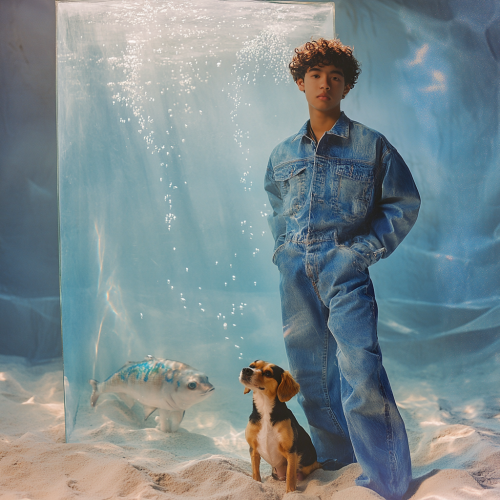 a young filipino-american teenage male with curly surfer hair, in denim outfit, concrete abstract studio background with a retro high school yearbook lighting feel standing on sand, abstract surreal photography . vogue editorial layout pose with david lachapelle influence. he stands in an abstract space that looks like boracay beach philippines. he stands on the sand, with a small jack russell with grafitti designed fur. he sits on a large glass box with water and fish inside
