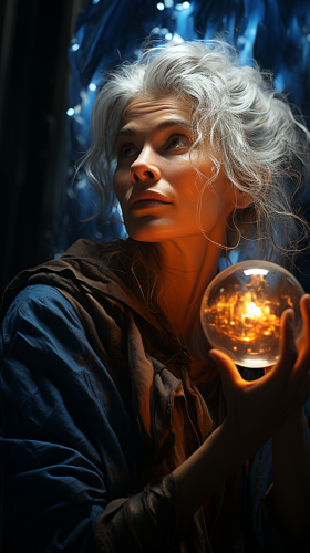 Portrait of a young old woman seeing the future in a cristal ball , cinematic composition, photo realistic, highli detailed --ar 9:16 --stylize 750 --v 5.2