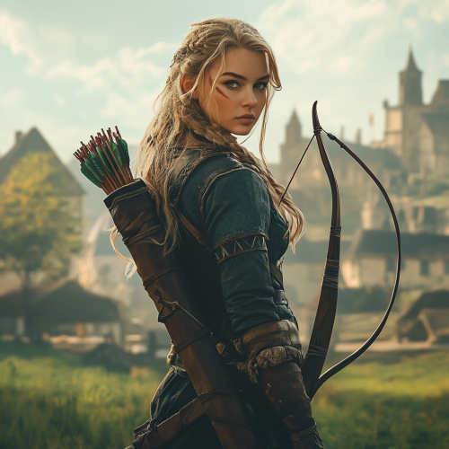 a realistic illustration of a woman in her 30s, an adventurer with long blond hair standing with a bow facing the camera and we see her from the knees up. She is wearing adventurer's clothes with leather armor and a backpack with a sword on her back. She is in a green field with medieval buildings in the background.