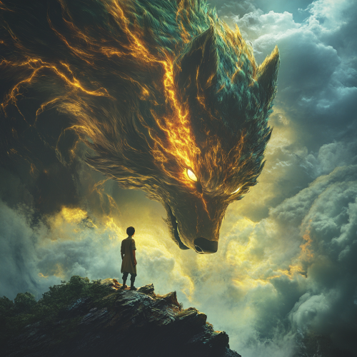 A highly detailed cinematic scene featuring a young boy standing on a cliff, facing a massive, mythical creature with the face of a wolf and the fiery, glowing feathers of a phoenix. The sky is dark and stormy, with swirling clouds and lightning illuminating the intense confrontation. The wolf-like creature’s sharp eyes lock onto the boy, who stands with determination, wind swirling around him. The atmosphere is filled with tension and dramatic energy. The color palette includes mythological tones of deep blues and greens with bright highlights of radiant gold and fiery reds, adding a vibrant contrast to the dark, stormy environment. The texture is crystal-clear, with a cinematic, movie-like quality, showing every detail from the creature’s feathers to the rocky cliff. The scene is rich in atmospheric depth, creating a sense of grandeur and power. The overall feel is both epic and dynamic, with a focus on the high-definition, movie-quality clarity of the image.