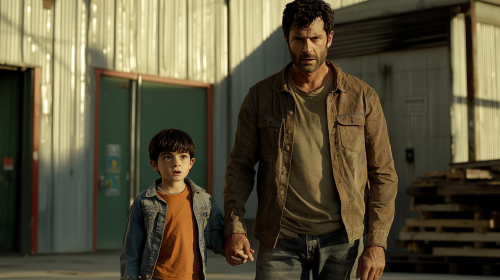 A man, wearing a brown jacket, beige t-shirt, and dark pants, stands in an empty warehouse or industrial area, his face marked by an intense, serious expression. Standing slightly behind him and holding his hand for protection is a young boy, around 10-12 years old, with short dark hair, dressed in a denim jacket over an orange t-shirt and jeans. The boy, with wide eyes and a fearful expression, clutches the man's hand nervously, seeking comfort in his presence. The warehouse is made of corrugated metal with a green door and a red fire extinguisher hanging on it. Wooden pallets are scattered across the floor. The sky is a pale blue, and the overall mood is one of tension and unease, with the boy's fear contrasting with the man's steely resolve. --ar 16:9