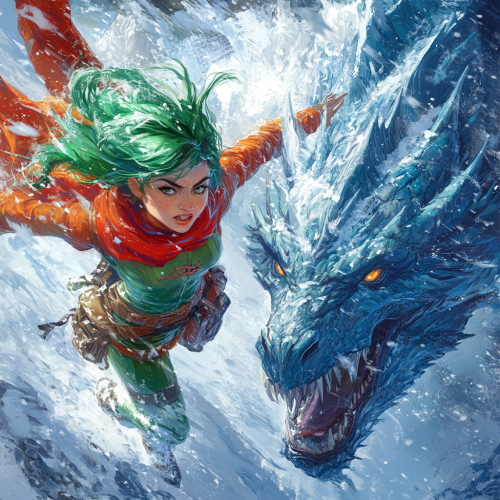 Create an image depicting a young woman with vibrant green hair and a colorful superhero outfit with a red scarf, engaged in a battle against a dragon in a snowy landscape. The dragon is enormous with icy blue scales that shimmer against the snowy environment. The scene captures the woman in mid-air, leaping towards the dragon with a determined expression, as snowflakes swirl around them. The dragon is rearing up, preparing to unleash a blast of icy breath, creating a dramatic and tense atmosphere