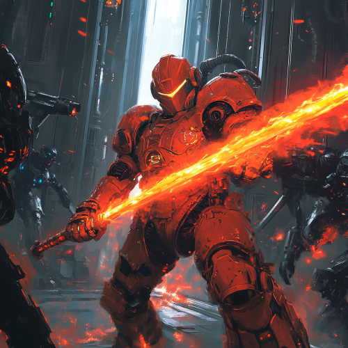 A warrior clad in red armor holds a sword radiating an orange-red glow, facing off intensely against multiple mechanical enemies. The warrior stands in a combat stance, looking forward, with flames flickering along the blade, enhancing the sense of motion and power. The background is a sci-fi style spaceship or space station corridor, scattered with various menacing robots, emphasizing the tension of the battle scene in a game setting. --v 6.1