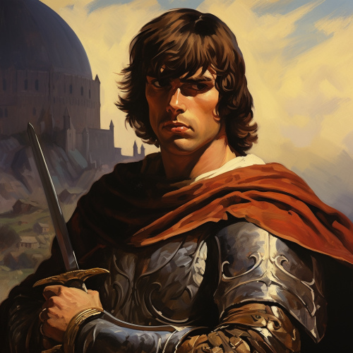 crusader with tabard prince valiant haircut gleaming sword determined expression HEMA guy, frank franzetta style