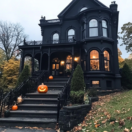A black Victorian house on a hill with steps and a black rod iron fence, a couple of trees in the yard, a pumpkin on the step, night time, spooky, fall, witchy aesthetic, realistic photo