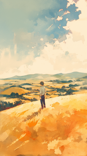 A picture using a more structured and bold watercolor style. A lone figure standing on a hill, looking out over a vast landscape of fields and distant mountains. The wind gently blows his hair, and he gazes in the direction of the distant train tracks, lost in thought. --ar 9:16 --niji 6
