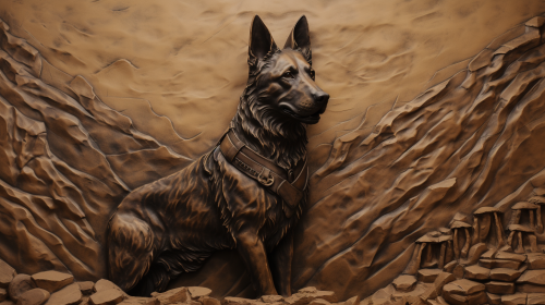 a heroic german shephard dog posing on top of a hill, Bas-relief, intricately detailed, serious face, subdued, classical --v 5.2 --ar 16:9