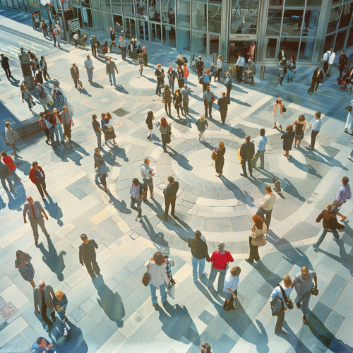 photograph from above of a busy sunny plaza where professional people are walking about or greeting each other
