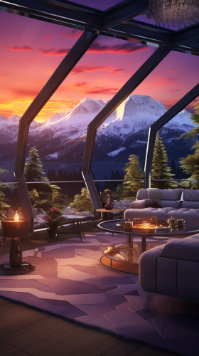 beautiful living room with view of snowy mountains aurora borealis, window view of snowy mountains , couch pit , room filled with plants with glowing accents on pots , ultra realistic, beautiful house with mosaic solar panels in a high forestry mountain , beautiful trees, beautiful modern futuristic home in the middle of a forest on a mountain with a view of the sunset, with large plants in room with glowing accents --ar 9:16