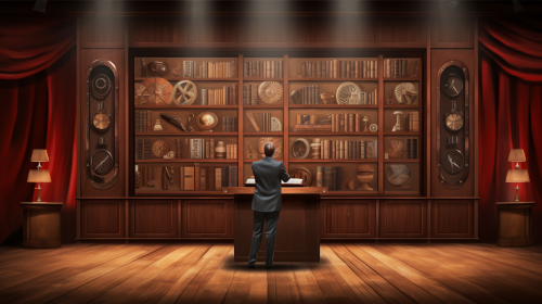 a game show set up like "Deal or No Deal", but instead of cases, there is a large wooden cabinet with drawers. A contestant standing at a podium choosing a drawer to open - mystery, gameshow --ar 16:9