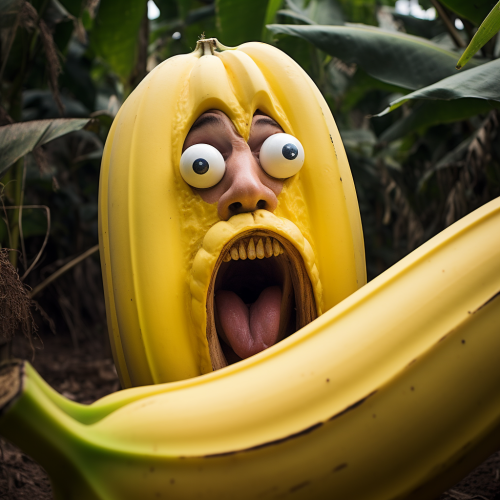 photo action shot, super intense, cool, interesting, giant banana with a face, eyes boggle --s 50