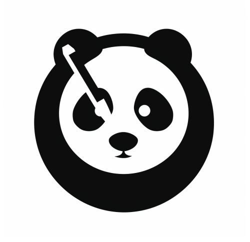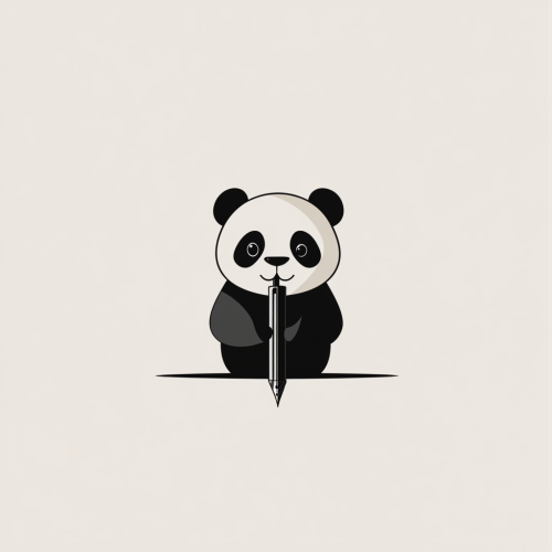 Logo in a minimalist style, featuring a shape with a panda holding an ink fountain pen. The background is a solid color, with letters at the bottom of the logo. The design is created using vector graphics, with simple shapes and lines, no shadows or gradients, and a combination of black and gray colors, resulting in a modern and professional-looking design. --v 6.1