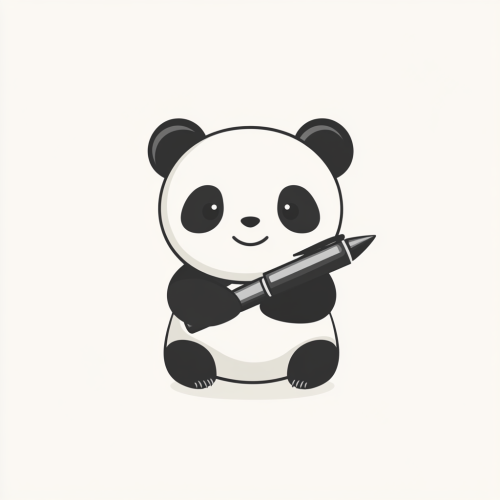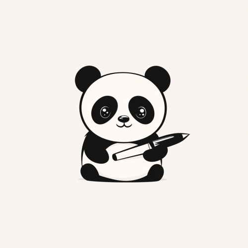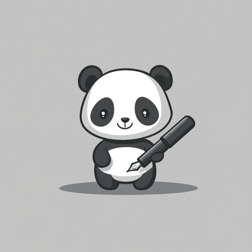 Logo in a minimalist style, featuring a shape with a happy cute panda holding an ink fountain pen. The background is a solid color. The design is created using vector graphics, with simple shapes and lines, no shadows or gradients, and a combination of black and gray colors, resulting in a modern and professional-looking design. --v 6.1