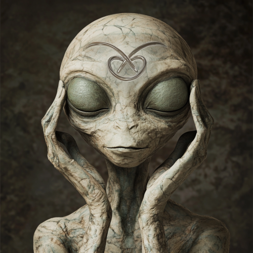 grey alien with fingers on temples eyes closed meditating with transparent infinity symbol projecting from forehead leaving motion trail behind in style of matt furie