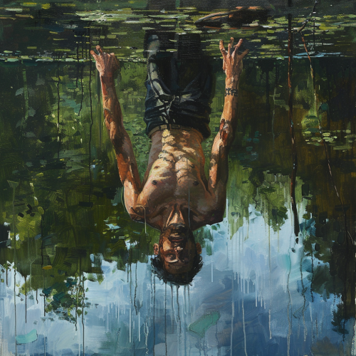 a person in fashion denim peering into the mirror. the scenery is upside down but he is right side up. surreal with very natural elements and deep textures. modern photography style