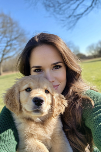 a 40 year old, attractive, Caucasian woman, with long brown hair and golden retriever puppy. The woman is wearing a grey sweater. The environment is white kitchen, grey velvet dinning chairs witch table. Taken with an iPhone. --s 55 --ar 2:3
