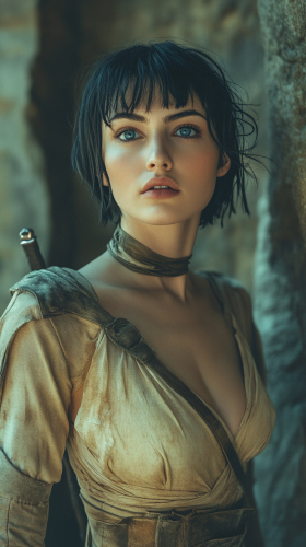 realistic photo. full body length. beautiful young woman. Conan outfit. Short black hair. Blue eyes. Lithe form. Fortress background. Cinematic, 35mm lens, global illumination, uplight. --ar 9:16 --v 6.1