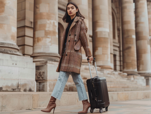 Create a black-and-white illustration featuring a woman in a vintage, gothic-inspired outfit reminiscent of Edward Gorey's characters. Use meticulous cross-hatching and fine details to emphasize the shadows and textures of her attire, particularly focusing on her leather vest and skirt. Depict her with an expressionless, almost detached gaze, and pose her in a poised stance, conveying a sense of quiet elegance. The background should be minimal, perhaps with only a few faintly sketched steps, to emphasize her solitude. Include subtle symbolic elements like a small, dark animal or a timepiece in the scene to evoke a mysterious atmosphere, staying true to Gorey's signature eerie and minimalist aesthetic.
