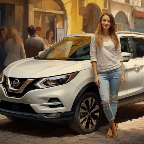 young tall caucasian woman standing near a white nissan qashqai, looking happy, realistic