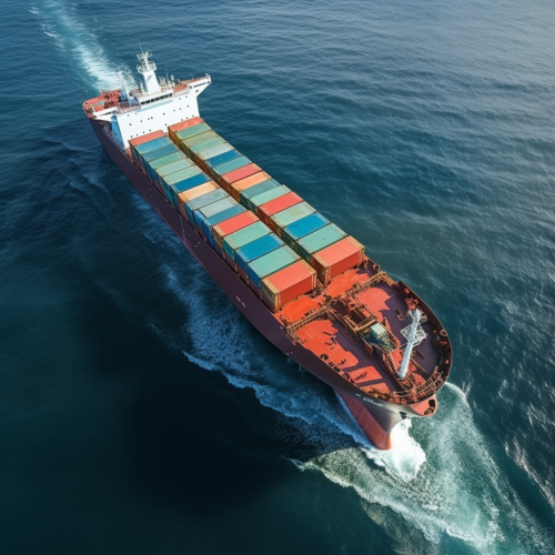 Do not use bright colors. A large cargo ship sailing across a calm ocean at sunset, with towering stacks of colorful shipping containers on its deck. The ship is positioned slightly off-center to the left, creating space on the right for text or graphics. The background features a gradient sky transitioning from warm oranges and pinks near the horizon to deeper blues at the top. Subtle waves ripple on the ocean's surface, reflecting the colors of the sky, while the ship casts a long shadow on the water. The scene evokes a sense of global trade and maritime commerce. Keep image dark as content font is white so it should not interfere with presentation content --ar 9:16 --turbo