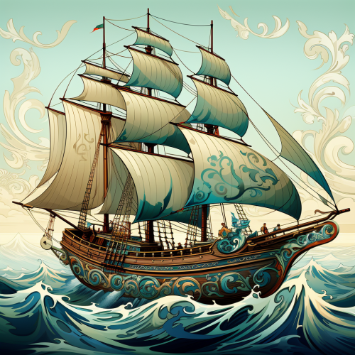 design of a medium size fishing ship, art noveau style, lots of detail, beautiful patterns, sailing in the wind
