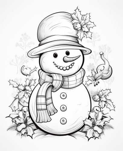coloring page for adults, simple strong black lines, NO SHADING, black lines only, sketch, no color, no grey, no gray, b&w only, subject ;cheerful snowman with a carrot nose and a top hat, --ar 9:11