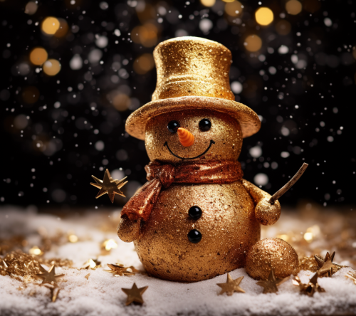 Snowman elegantly illuminated at night, surrounded by twinkling fairy lights, dressed with a stylish scarf and hat, softly glowing against a dark snowy background, creating a magical and sophisticated winter night atmosphere. Photorealistic, highly detailed, 8K resolution --ar 3:2 --v 6.1 --style raw