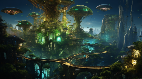 Illustrate an aerial perspective of futuristic byzantium's lush floating gardens intertwined with the intricate network of emerald-powered skylanes. Hovercraft traverse the verdant canopy, leaving vibrant trails of illumination in their wake. Depict the juxtaposition of organic beauty and technological advancement, with particular attention to the vibrant colors and ethereal atmosphere --ar 16:9