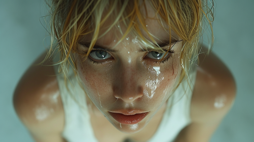 Realistic picture of a distressed girl with blonde hair and snow white skin crying, tears in her eyes. In front of a white background. Her face contorted in a mix of anger and sadness. Capturing the depth of her emotional turmoil. Tears streaming down her cheeks. She is wearing a white v top. low angle shot, low camera angle. photorealistic, 8k, natural lighting, Opt for soft, natural lighting, accentuating her features with a gentle glow. ensuring a dreamlike color palette. Create a visually captivating image epitomizing the allure of high-end fashion for the cover, real photograph, --ar 16:9 --stylize 750 --v 6.0 --quality 0.5 --style raw