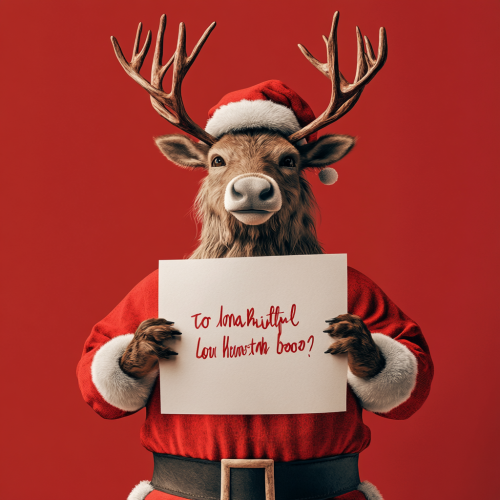 Generate a realistic image of a reindeer dressed in a festive holiday outfit, similar to a Santa Claus costume. The reindeer is holding a large piece of paper with both hooves in front of its body. The paper has handwritten text in bold red and black colors, creating a playful, festive message. The background is a bright, solid red to emphasize the holiday theme. The reindeer should have antlers and a friendly expression, and the overall image should convey a fun, holiday spirit, replacing Santa Claus with the reindeer character. Ensure the focus remains on the reindeer holding the sign with the holiday message, just like a holiday-themed poster.
